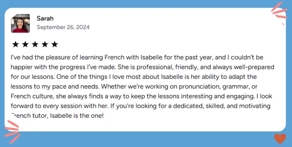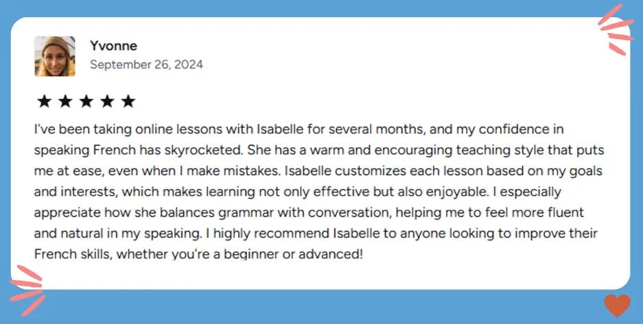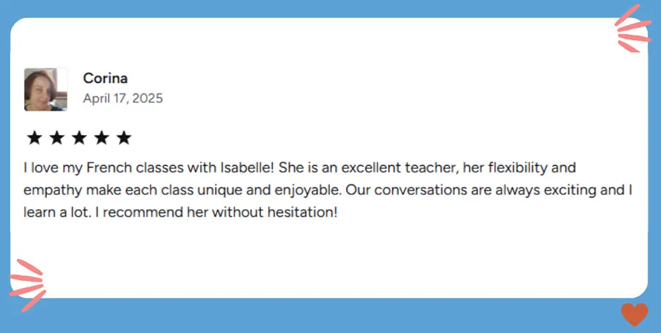 Your Teacher: Isabelle, Expat & French Guide. I’ve been teaching French online full-time since 2021, specializing in adults who want real-life fluency—not just textbook perfection.